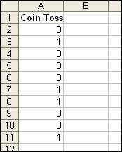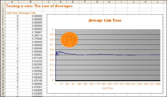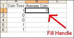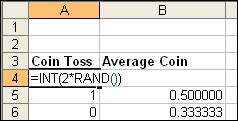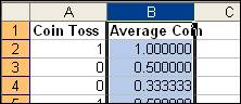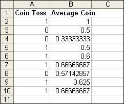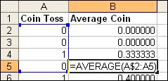 The “Average Coin” column is the average of all previous tosses Cell B5 contains the average of cells A2 through A5 |