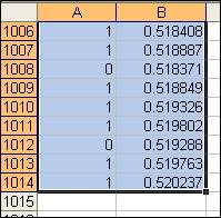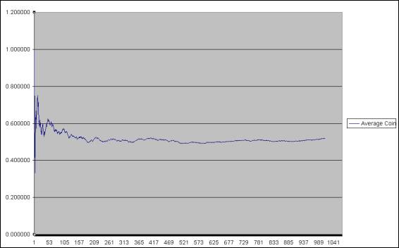 So, you’ve recorded ten coin tosses. You have a “running average” of the tosses. Now you’ll do at least 990 more coin tosses. Really! But the computer is going to do the coin tossing. RAND is an Excel function that returns a random number that is greater than or equal to 0 and less than 1. For example: 0.12523, 0.938923, and 0.23923. With a little math, we can use RAND to randomly get either a 0 or a 1, and nothing in between. Look at: =2*RAND() This doubles the normal RAND function and returns a random number greater than or equal to 0 and less than 2. For example: 1.3923, 0.4239, etc. We want only whole numbers, so we use the INT function, which strips off the part to the right of the decimal point. For example, INT(1.5232) returns 1. So: =INT(2*RAND()) returns either 0 or 1 with equal probability, just like flipping a coin. |